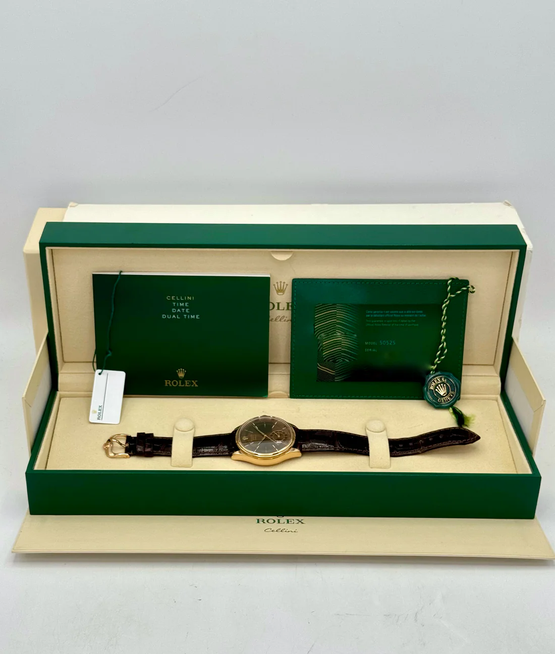 2020 Rolex Cellini Dual Time 39mm 50525 Rose Gold Brown Dial