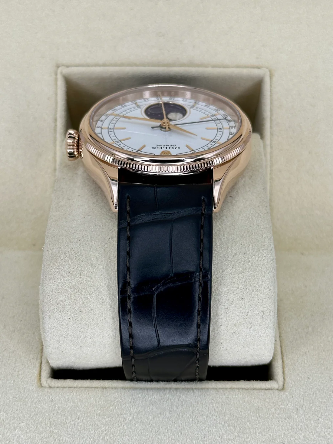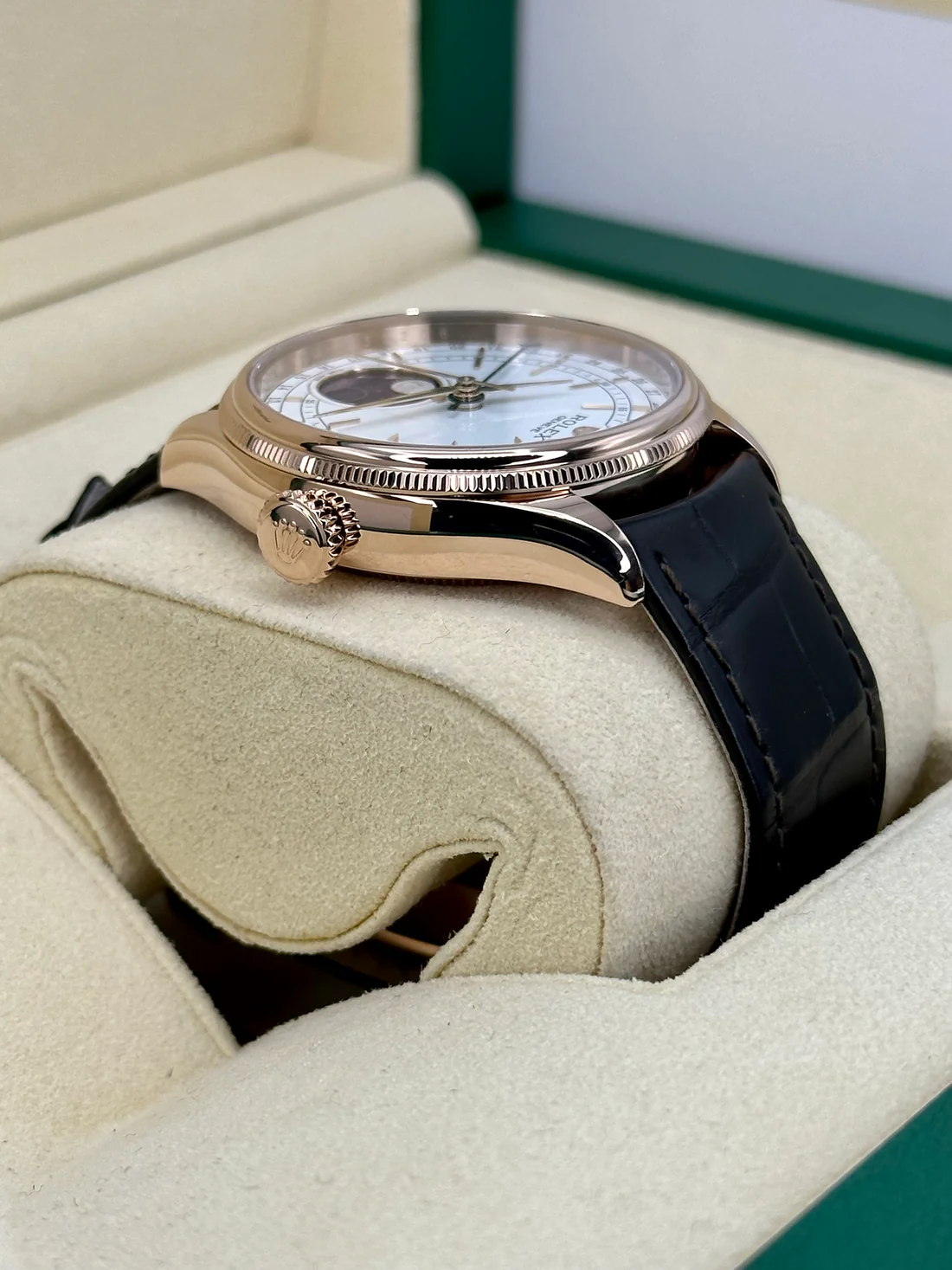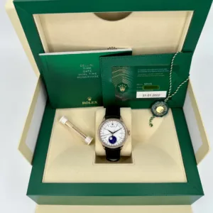Be the first to review “2022 Rolex Cellini Moonphase 39mm 50535 Rose Gold White Dial”