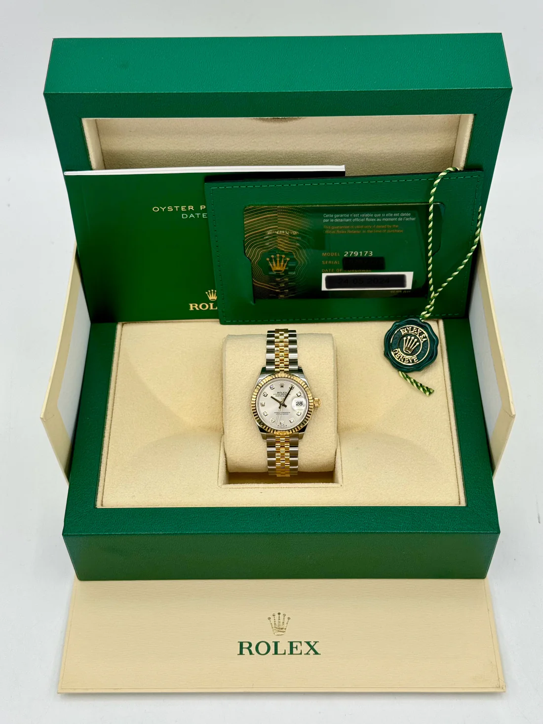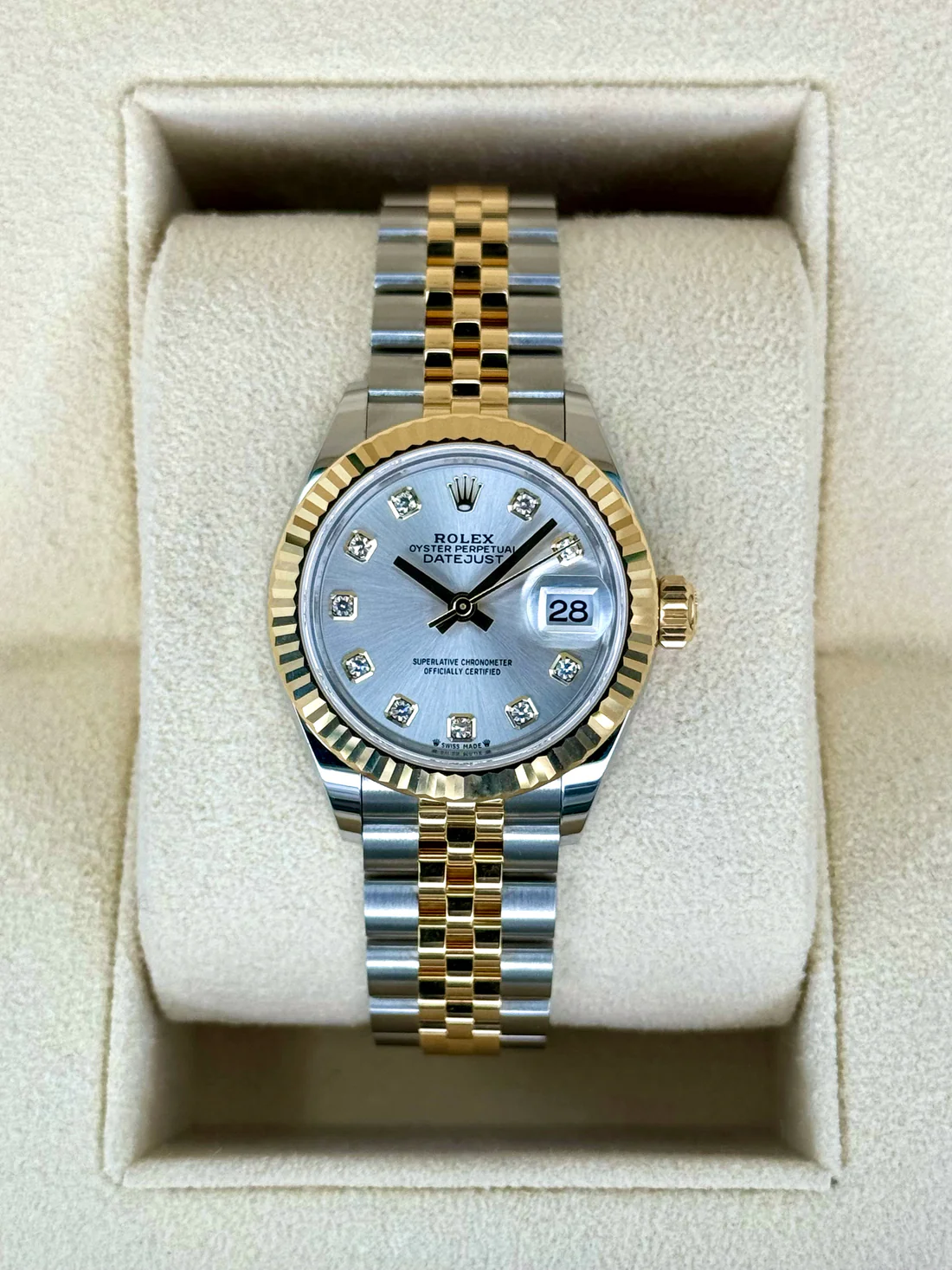 NEW 2024 Rolex Lady Datejust 28mm 279173 Two-Tone Stainless Steel and 18k Yellow Gold Jubilee Bracelet Silver Diamond Dial